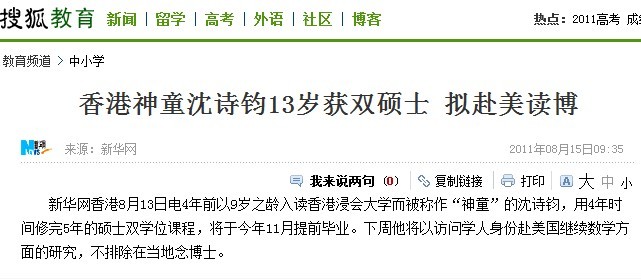香港神童沈诗钧13岁获双硕士 拟赴美读博